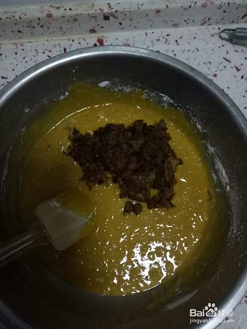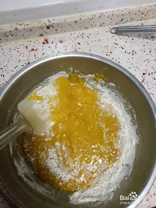 把低筋面粉,放入蛋黄液中,用硅胶铲,像炒菜哪有给他拌匀