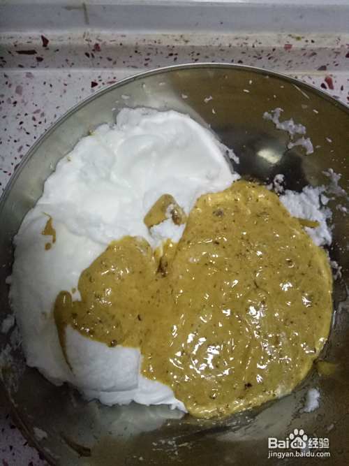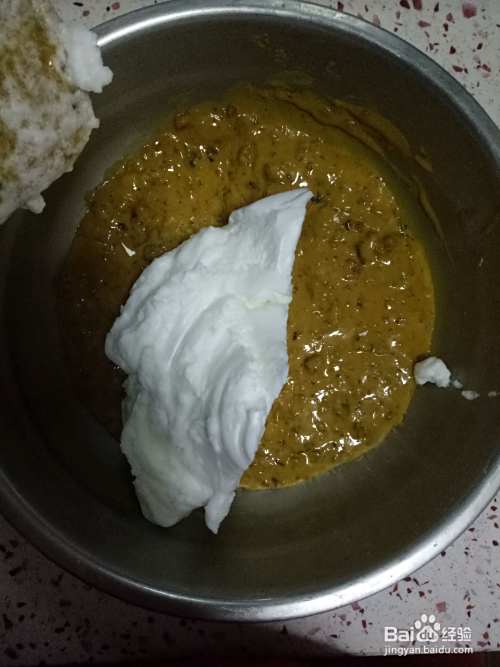 把三分之一的蛋白,放进蛋黄液里搅拌均匀