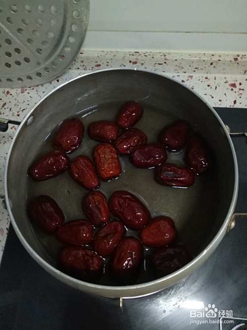 大枣放锅里,加入水,大火煮开后,小火煮20分钟,完了放在温水里泡着