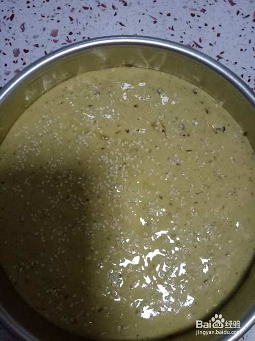 正常放进方形的磨具里,我没有,所以放进八寸的磨具里,上面撒上芝麻,在台子上,把磨具垫动几天,拍拍蛋糕里的气泡,完了放进烤箱里,我家烤箱瓦数小,我用的是180°考了55-60分钟