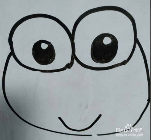 在青蛙头部的下方画一个向上的弯弯的弧线,给青蛙画出大嘴巴。