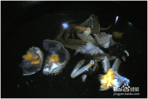 用小刷子将河蟹清洗干净,拆去蟹脚,将大脚拍碎,小脚切段。将蟹身切成四块,去掉腮。