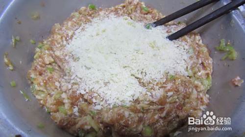 搅好的肉馅放入面包屑,继续搅拌。加它是为丸子松软不硬。