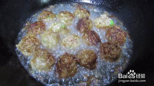 锅里倒油,用左手拿起肉馅,从手掌虎口处,往外挤到锅里,用油炸。