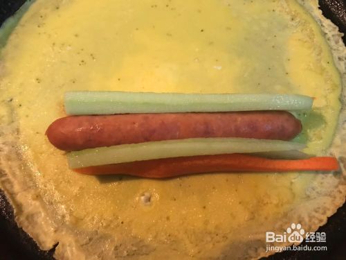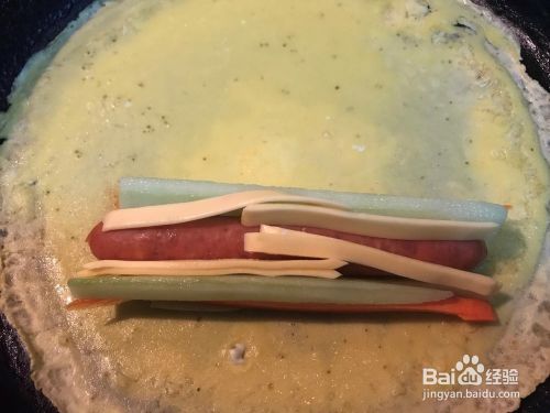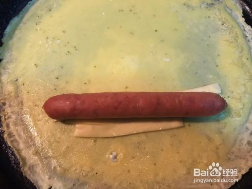 鸡蛋饼上靠近1/3的位置上,加入芝士条,再加入一根学生火腿,如图所示。
