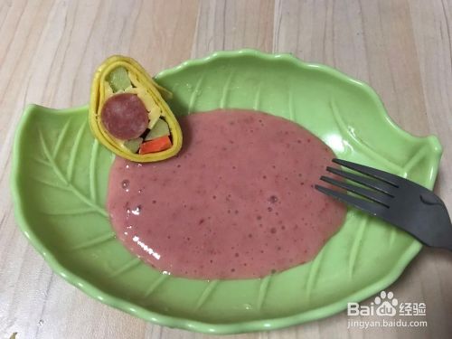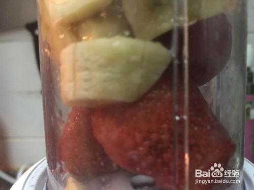 如果想多些口味,可以自制一些果酱,比如将5个草莓、半根香蕉和适量酸奶加入料理机,搅拌成果酱,如图所示。