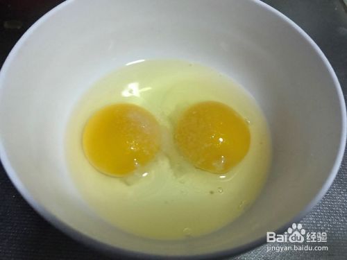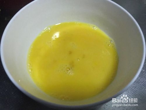 鸡蛋2个,加入适量盐,打成鸡蛋液,如图所示。