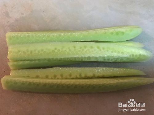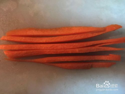 胡萝卜和黄瓜洗净,削皮,切成约10cm长的细条,如图所示。