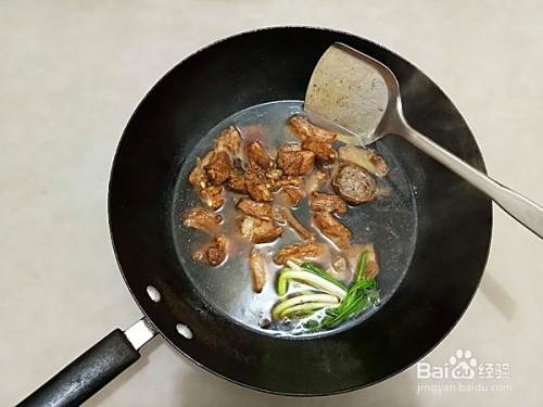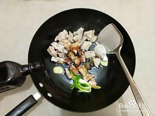 锅中放少许油,放入焯过水的排骨稍微炒一下,放入生抽、老抽、冰糖、炖肉料包、生姜、香葱等调料