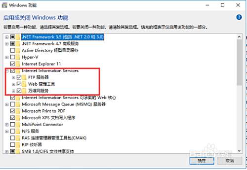 在“Windows功能”对话框里选中“Internet Information Services”,在Internet Information Services功能展开选择框里根据你的需要选择你需要的功能就行了,比如本人要用FTP功能,能运行ASP.NET程序等等,只要选中这些功能就行了。并点击“确定”按钮。