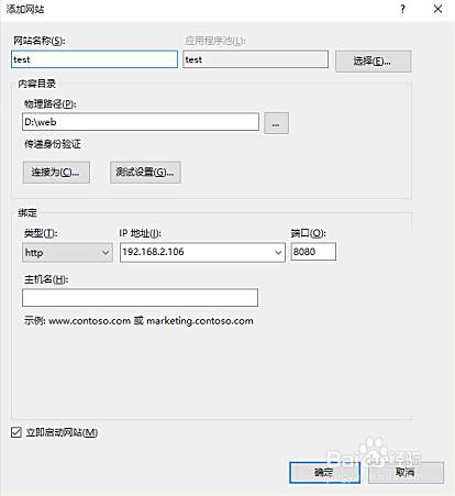 在添加网站对话框中,输入网站名称,选择物理路径和端口,其他默认,然后确定。物理路径,选择存放发布后的文件系统的文件夹