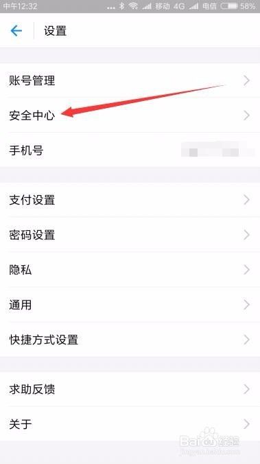 在打开的支付宝设置页面中,点击“安全中心”菜单项。