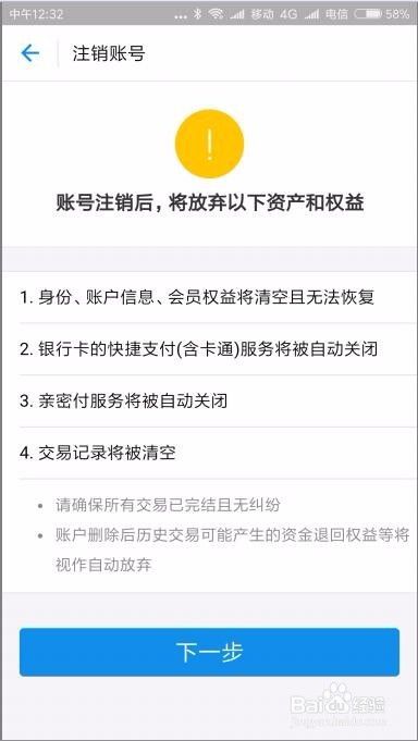 接着在弹出的注销账号页面中,会提示注销账户后的情况,点击“下一步”按钮就可以了。