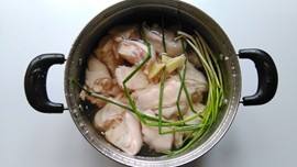剁好的猪蹄处理干净加葱,姜,料酒焯水。