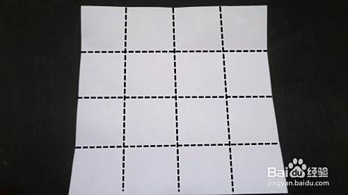 先把纸张折叠12个小正方形格子,折叠方法是边对边平均对折出“十字”再把四边的边线对中间线平均对折,这样就出来了