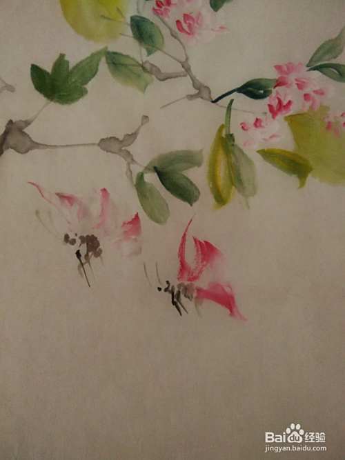 最后用盘子里剩下的颜料画两只蝴蝶,这样画面会更生动一些,然后用墨勾出叶脉即可