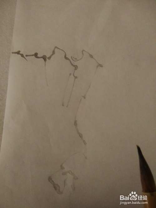 首先用比较干的毛笔蘸墨汁勾勒出山石的外轮廓,要用侧锋行笔哦