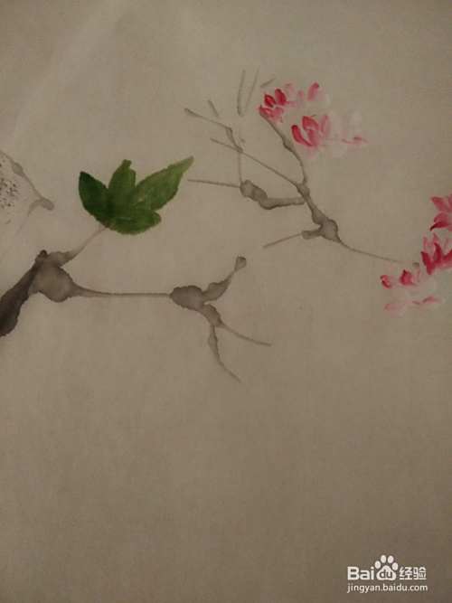 然后用花青加藤黄调成草绿色画出叶子,叶子可以少一些,注意围绕在花朵周围