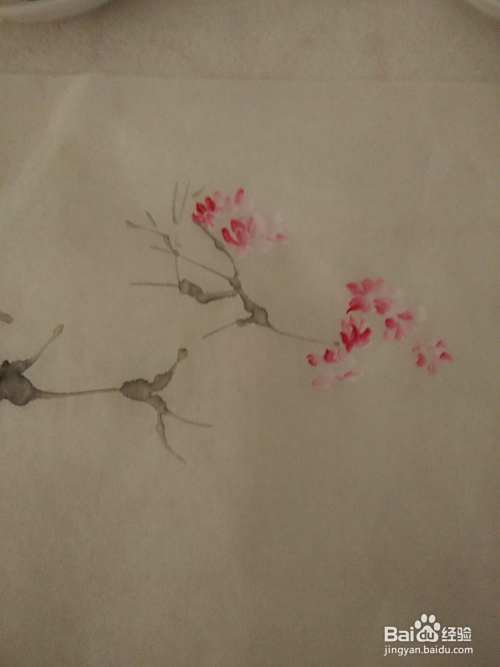 接着先用毛笔沾满调和过的钛白粉,然后笔尖蘸比较浓的曙红颜料,用点染的方式画出花朵
