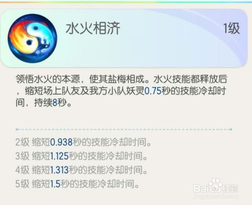龟丞相的技能,技能3:水火相济。这个技能是缩短场上队友及我方小队妖灵的技能冷却时间,持续8秒。初级是0.75秒,满级1.5秒。如图