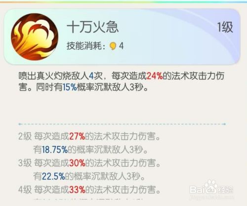 龟丞相的技能,技能2:十万火急。攻击技能,喷出真火灼烧敌人4次,每次造成24%的法术攻击力伤害,同时有15%概率沉默敌人3秒。如图