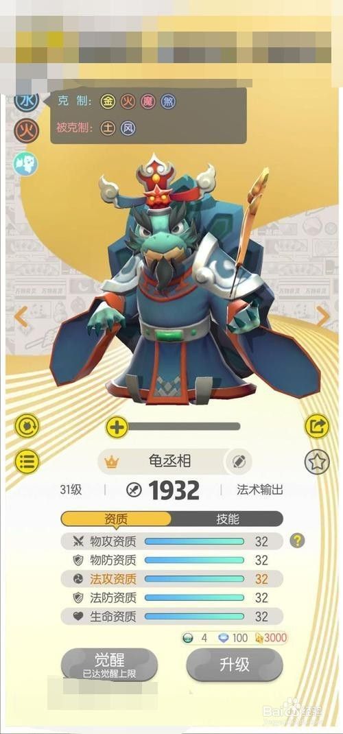首先,龟丞相的形象是一手法旨,身穿丞相服装的老龟。它的资质是法攻资质,是一个法术输出的妖灵。如图