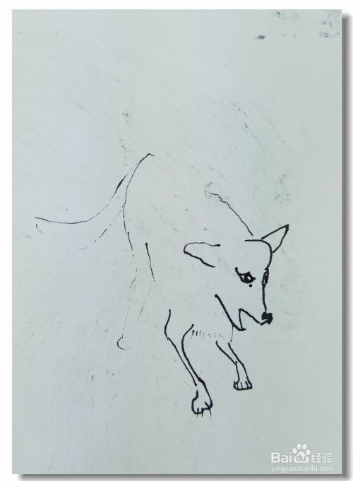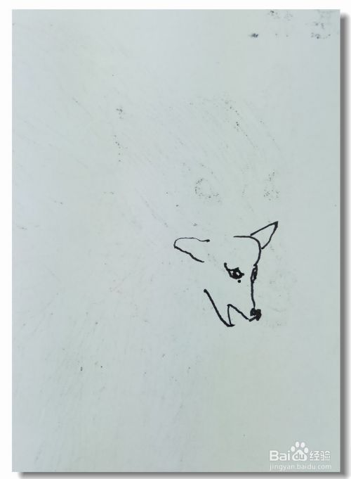在白纸上画出狼的头部轮廓,并画出狼的眼睛,鼻子,嘴巴和它的两个耳朵。