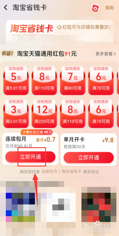 在页面上找到连续包月,点击下方的立即开通即可,页面会有出现一定的抵扣红包,购买月卡也是比较划算的。
