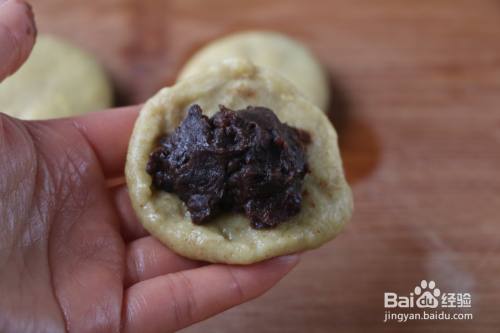 6、取适量的面团,抻薄,包上适量的豆沙馅儿;