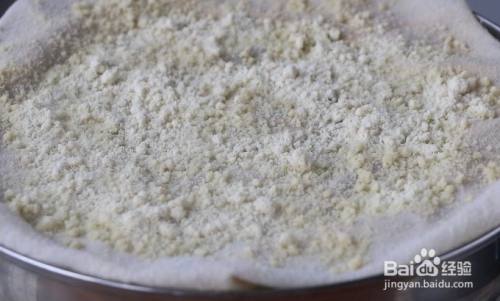 2、锅中烧开足够的清水,然后放笼屉,铺上湿纱布,再把大黄米粉一层层撒在上面,每次撒之前要等变色之后再撒;