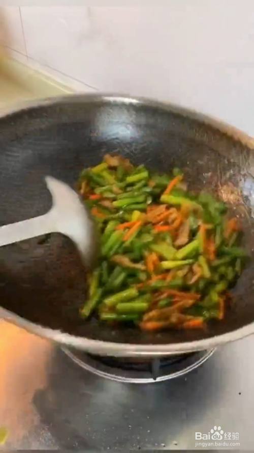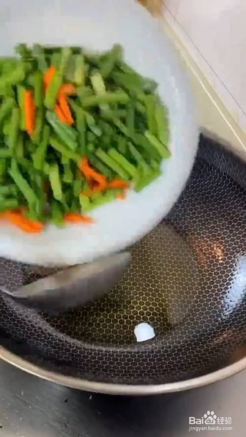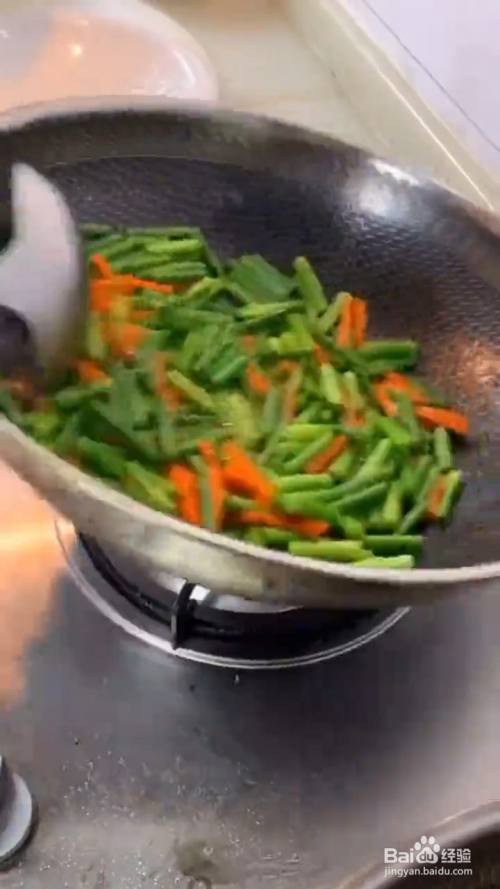锅留底油 下入蒜苔 胡萝卜 大火翻炒均匀;