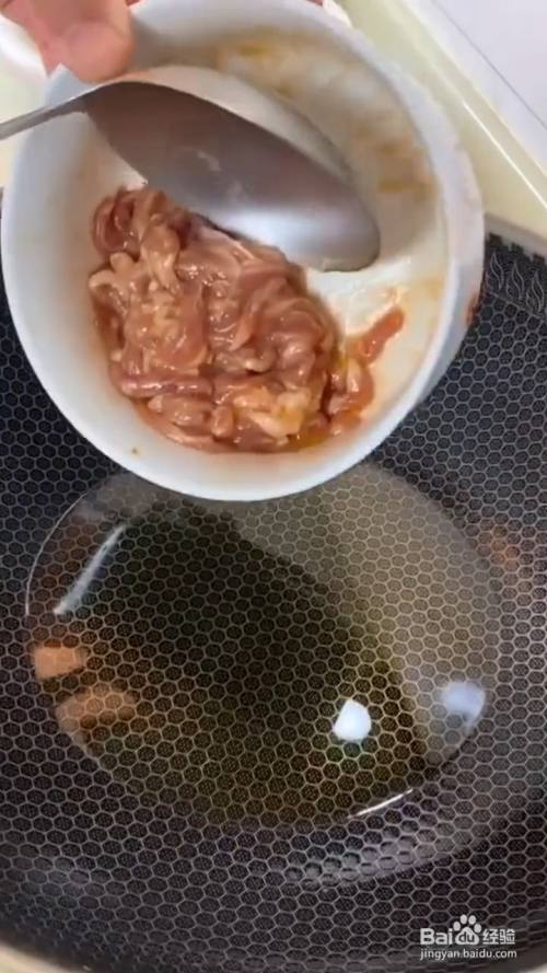 锅中油热 下入腌制好的猪肉翻炒至变色 盛出备用;