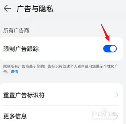 使用华为mate40pro关闭限制广告跟踪后,即可屏蔽手机的广告。以下为详细步骤说明: