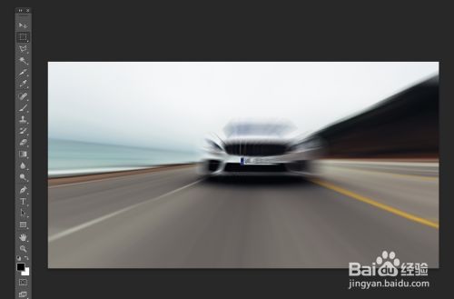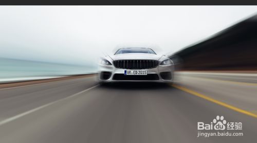 最后我们从汽车中心向外拉拽渐变线就可以完成汽车飞驰的效果了。