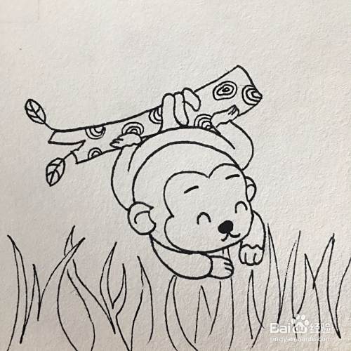 3、接着画出猴子尾巴勾着的一棵树枝,叶子是树干部分的点睛之笔。
