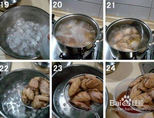 23-26、把煮熟的鸡翅在冰水盆中彻底冰透后捞出控净水份,然后倒入带有事先放好味汤的保鲜盒中,密封好保鲜盒的盖子,放入冰箱的冷藏室低温腌制4-5小时后便可取出食用,在食用时捞出鸡翅控净汤汁浇一些葱油和辣椒丝等即可。