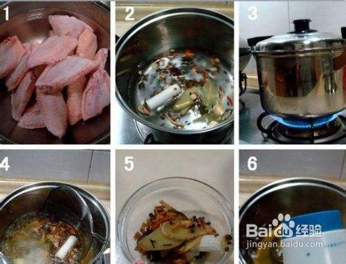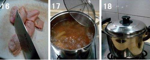 14-18、锅中再次注入清水倒入刚才捞出的香料煮开,煮开后再次捞出香料不要。把每只鸡翅上斜划两刀然后放入料水锅中,汤烧开后煮3分钟关火,然后加盖静置,用锅内的80-95度的汤温焖制10分钟。