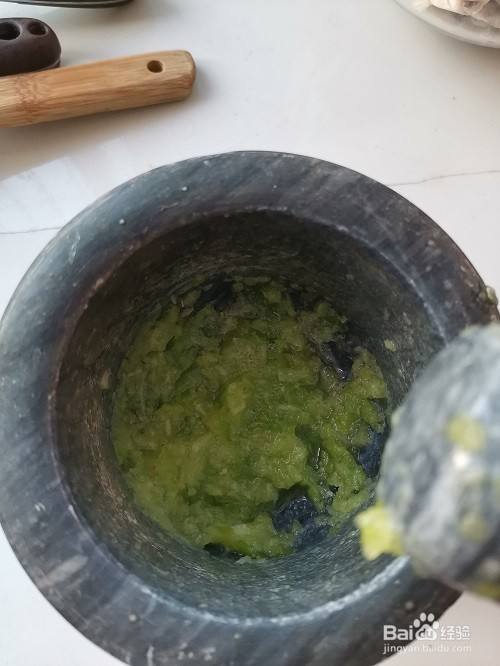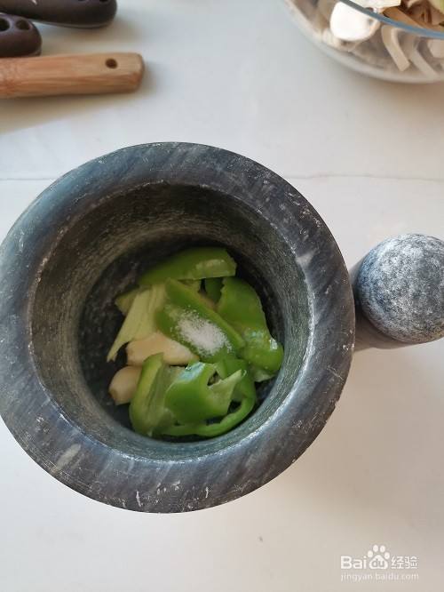 将青椒和大蒜放入到捣蒜的容器内,加入2克食盐,捣碎。如下图即可。
