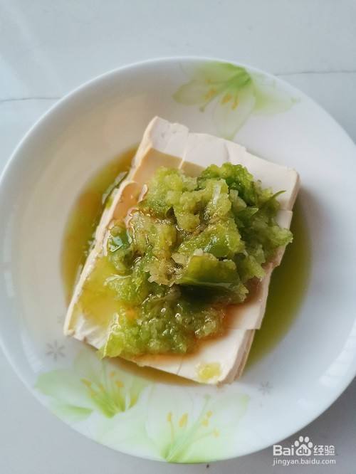 将捣好的青椒蒜泥铺到豆腐块上,滴上几滴香油。