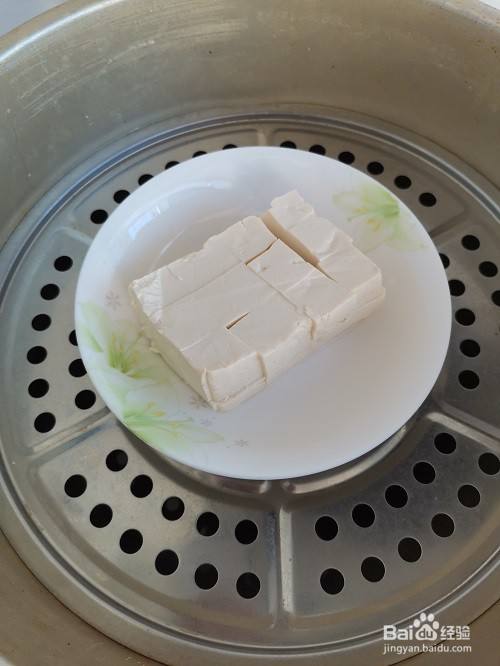 嫩豆腐切成大小均匀的块,放到蒸锅里。开大火,水开上热气蒸一分钟即可。去去豆腥气,蒸一下吃着更卫生。