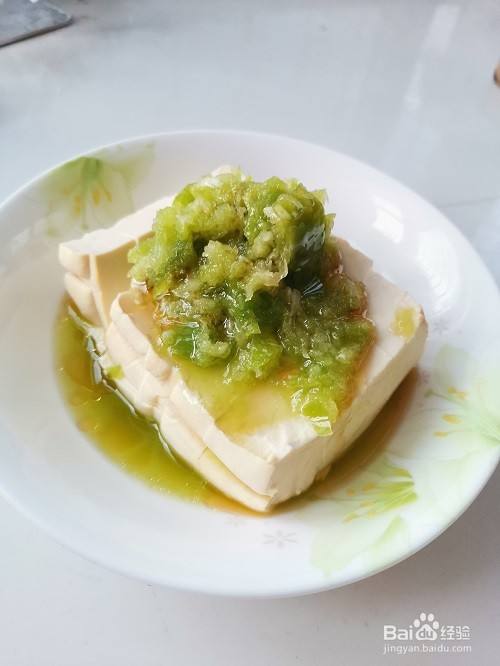 烧鲅鱼剩了一块豆腐,不算多,怎么吃呢?用青椒和蒜泥做个浇头,拌豆腐吃,很清香很下饭,快看。