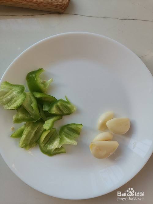 洗净青椒,切下半个,掰成小块。大蒜四瓣,去皮洗净。