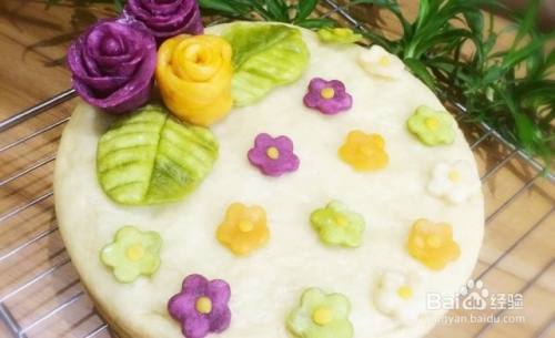 将二次发酵好的彩虹馒头蛋糕上蒸锅,上汽后转大火,蒸30分钟,关火取下保鲜膜,然后继续蒸30分钟(用筷子插入馒头蛋糕,如果筷子没粘上湿面,就说明熟了)出锅,倒扣,脱模。(因刷了食用油,蛋糕模一倒扣,馒头蛋糕就直接脱模了),出锅,摆上蒸好的玫瑰花、小花装饰即可。
