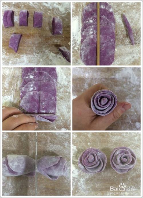 趁面醒发的过程,开始做装饰-玫瑰花,取20g发酵好的紫薯面,再揉一下排气,滚搓成长面团,切成均匀大小6小剂子(5个做花瓣,1个做花蕊),取一份小面团揉成团,压一下用擀面杖擀成圆形,依次擀好切下的小面团,5张面皮和细条按图中叠放,中间用筷子压条线后慢慢卷起,然后对切。花朵就这样出来了。