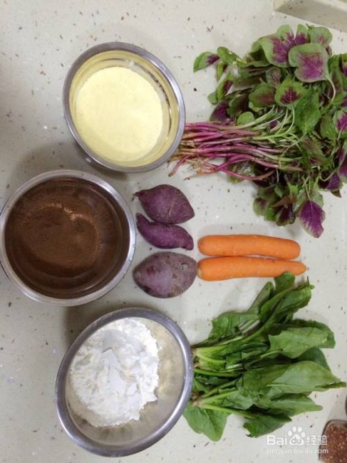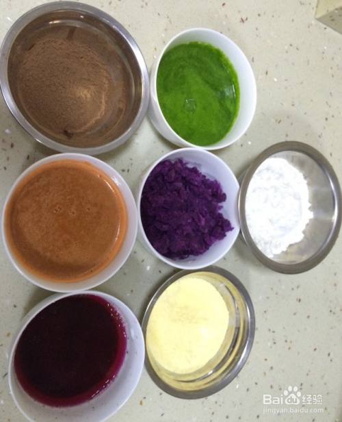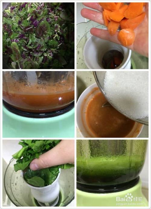 将苋菜洗净,切小段,少放水,煮一会儿,颜色就出来了,汁倒出来加白砂糖备用。然后再将胡萝卜、菠菜榨汁加白砂糖备用。