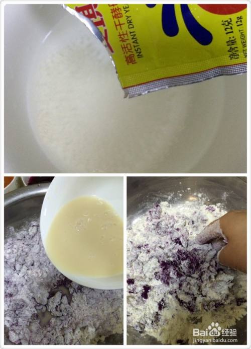 将紫薯泥倒入面粉中,然后加入温水调好的酵母水,开始和面。(胡萝卜汁、白面、可可粉、玉米面、菠菜汁、苋菜汁同上)
