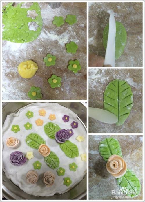 小花更简单,直接取一块小面团擀成皮,然后用切花膜之间切出来就行了,花心用黄色面团搓成小圆点放上去就好了。