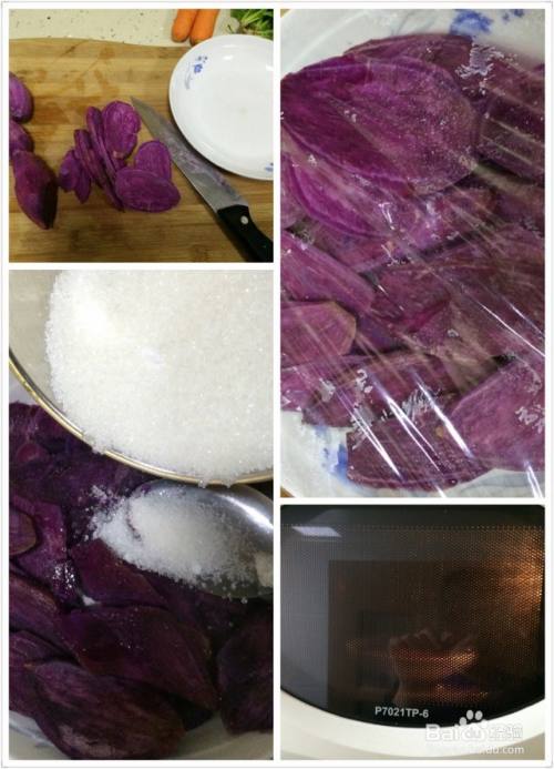 将紫薯去皮、切成薄片,盖上保鲜膜,进微波炉高火叮6分钟。取出,加白砂糖压泥备用。