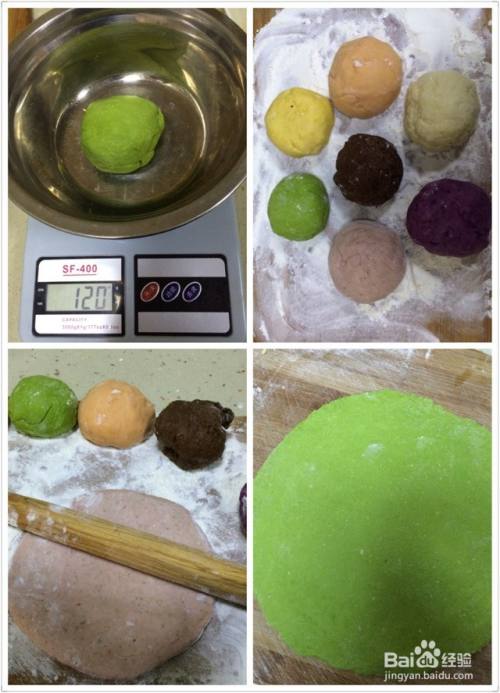 取出发酵好的菠菜面团过电子称,7种颜色每个面团重量都要120g。然后开始揉菠菜面团,使劲揉至光滑,再将面团擀成0.5cm左右厚大圆饼。(紫薯,胡萝卜汁、苋菜汁、可可粉、玉米面、菠菜汁面团同上)