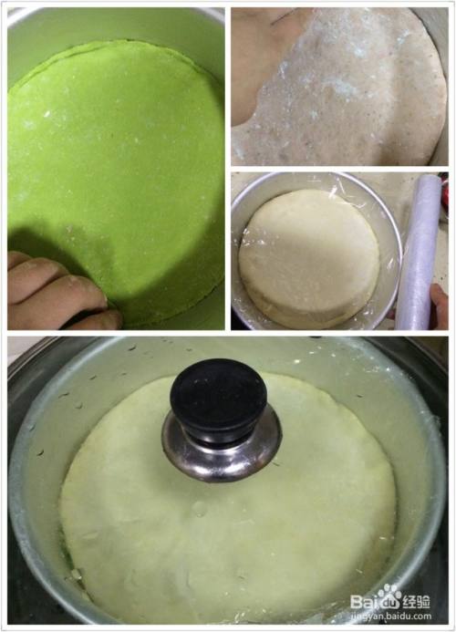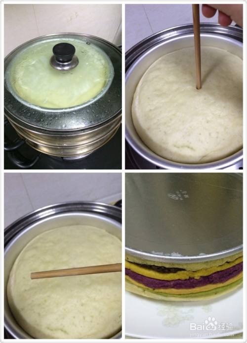将擀好的菠菜汁、苋菜汁、玉米面、胡萝卜、紫薯、可可粉、白面皮依次摆放进蛋糕模,然后盖上保鲜膜上蒸锅进行二次醒发30分钟。
